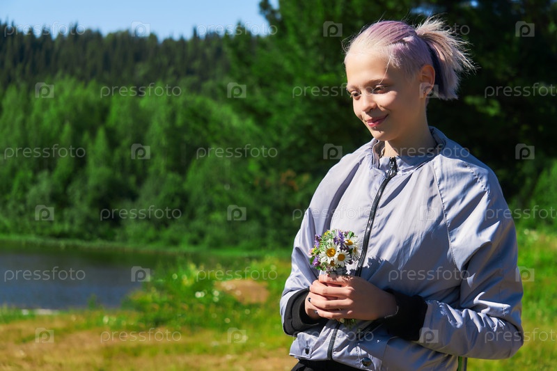 Девушка с букетом полевых цветов на природе у реки