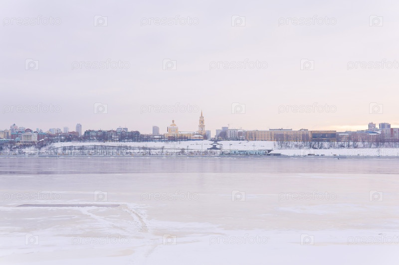 Вид на исторический центр Перми, Россия, с правого берега реки Камы зимой