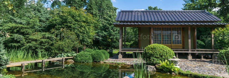 Японский сад с прудом, зигзагообразным мостиком, каменным фонарем и чайным домиком