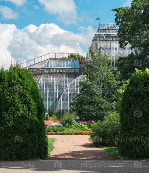 Пейзаж древнего ботанического сада с клумбами и старинной пальмовой оранжереей на заднем плане