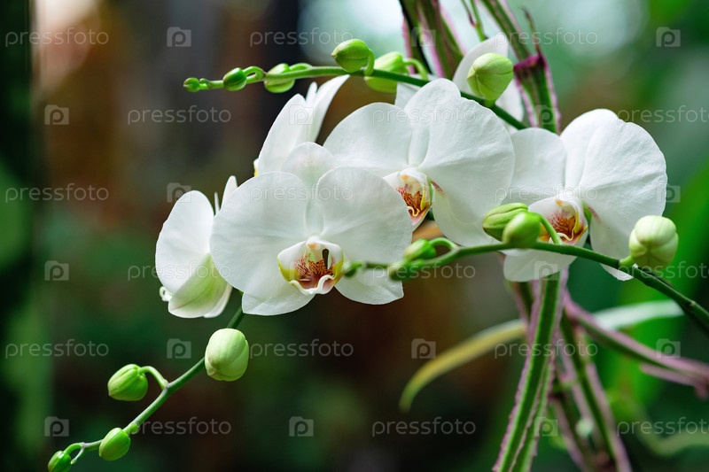 Цветущая орхидея белого мотылька среди тропической растительности крупным планом
