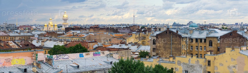 Панорамный вид на крыши исторического центра Санкт-Петербурга перед дождем
