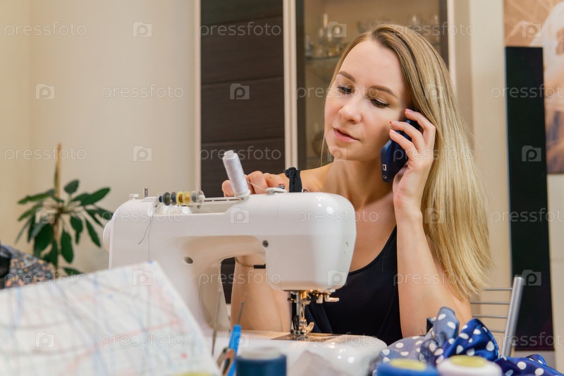 Женщина за швейной машинкой разговаривает по телефону