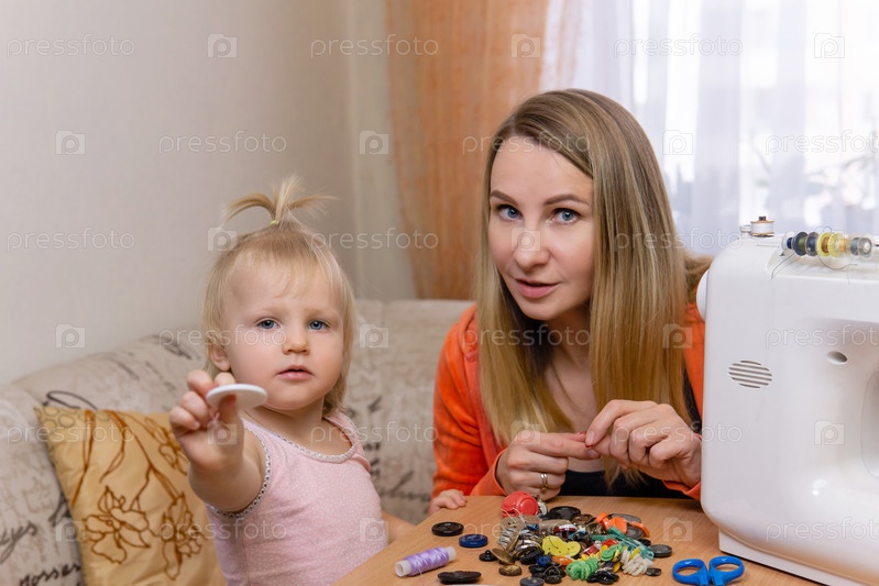 Мать общается со своей маленькой дочерью, перебирая кнопки