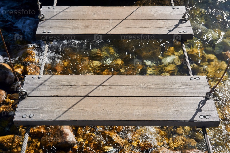 Фрагмент пешеходного подвесного моста через мелкую реку