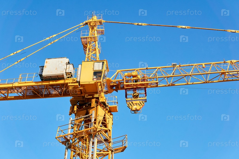Фрагмент строительного башенного крана с кабиной на фоне голубого неба