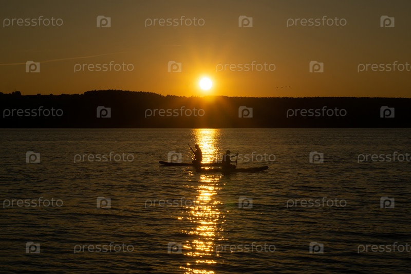 Два серфера на досках для серфинга на фоне заходящего солнца