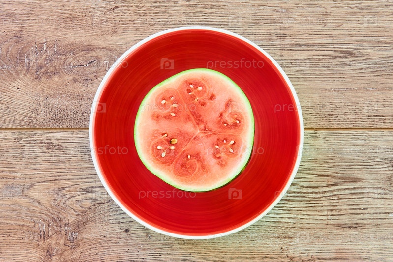 Маленький спелый разрезанный пополам арбуз на красной тарелке на деревянном столе