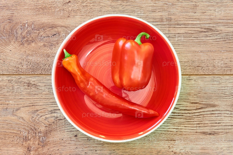 Тонкие и толстые стручки разных сортов сладкого перца на красной тарелке на деревянном столе