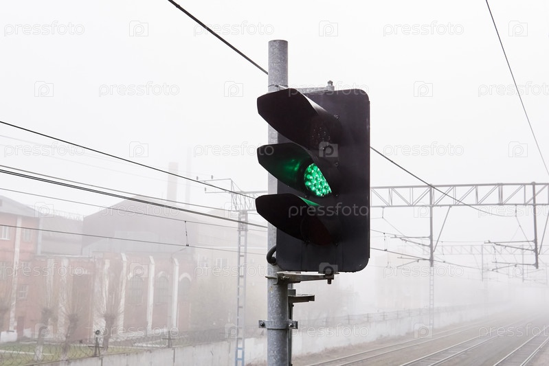 Железнодорожные рельсы скрываются в тумане, на переднем плане светодиодный железнодорожный сигнал зеленый