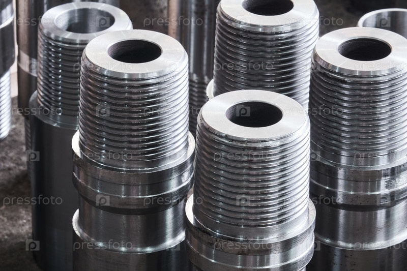 Промышленный фон - в мастерской новая блестящая стальная фурнитура, детали турбобуров разного диаметра