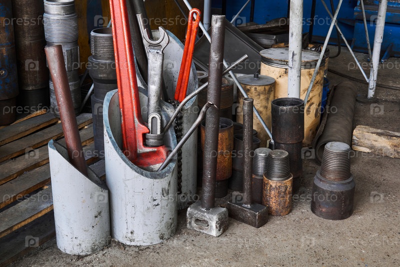 Фрагмент интерьера мастерской с деталями бурового оборудования и различными инструментами
