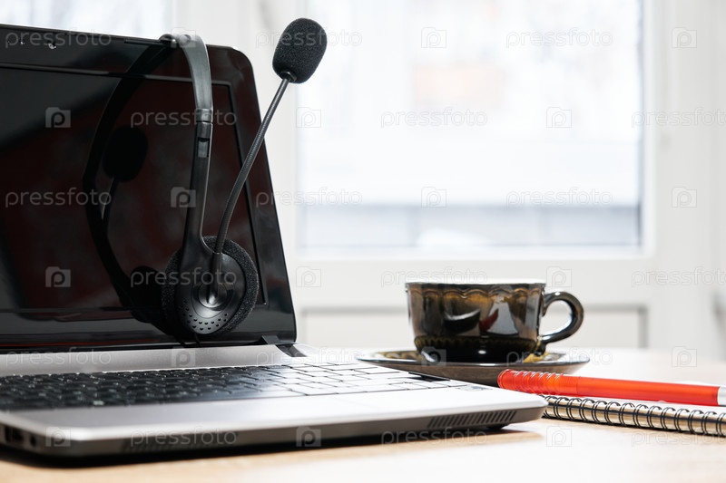 Ноутбук с наушниками, блокнот с ручкой и чашка кофе на столе крупным планом