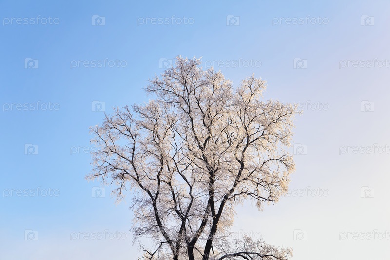 Зимнее дерево покрыто инеем на фоне голубого неба