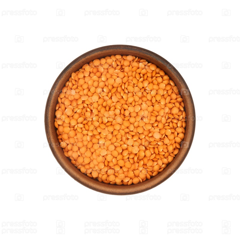 Красная чечевица в глиняной миске на белом фоне, вид сверху