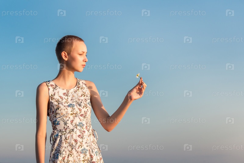 Девушка-подросток в платье с короткой стрижкой смотрит на цветок в руке на фоне неба