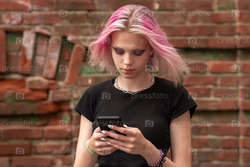 Девушка-подросток пишет или читает сообщение по телефону на фоне старой стены