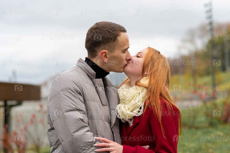 Молодая пара целуется на улице