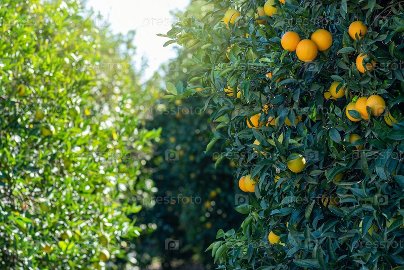Ряды апельсиновых деревьев на фруктовой плантации крупным планом