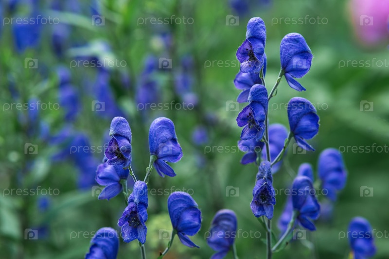 Синие цветы аконита крупным планом на размытом естественном фоне