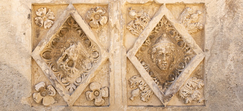 Полустертые каменные рельефы на руинах здания в древнем городе Мира, Турция