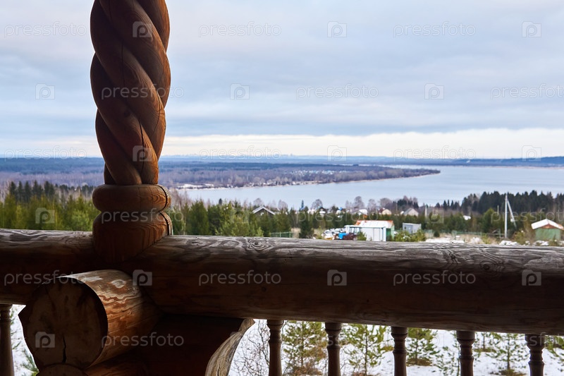 Деревянные перила веранды деревенского дома на фоне зимнего пейзажа
