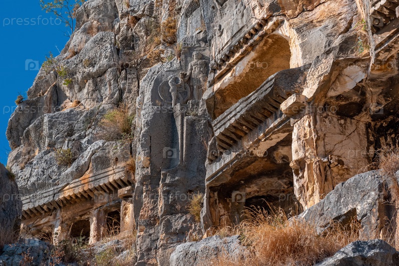 Фрагмент знаменитого комплекса скальных гробниц в руинах Мир Ликийских с рельефами на скале