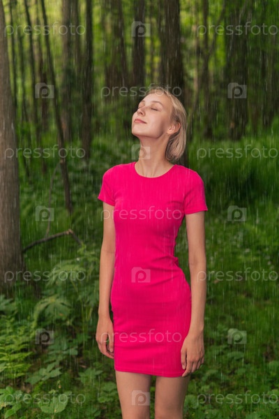 Красивая девушка радуется летнему дождю во время прогулки по лесу