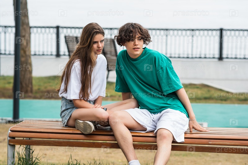 Двое молодых людей, парень и девушка, сидят на скамейке в прибрежном парке