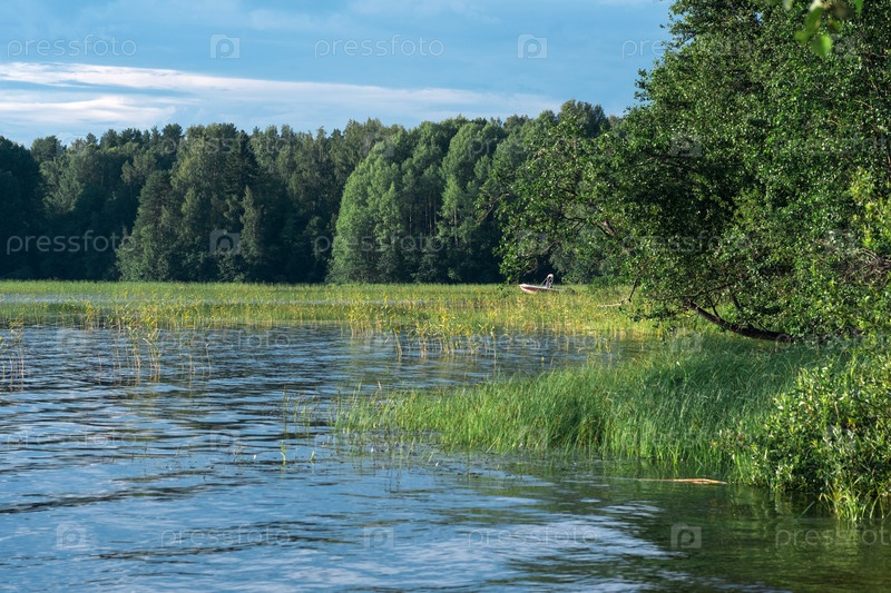 Лесистый берег озера с тростниковыми зарослями в солнечный день, в камышах видна рыбацкая лодка
