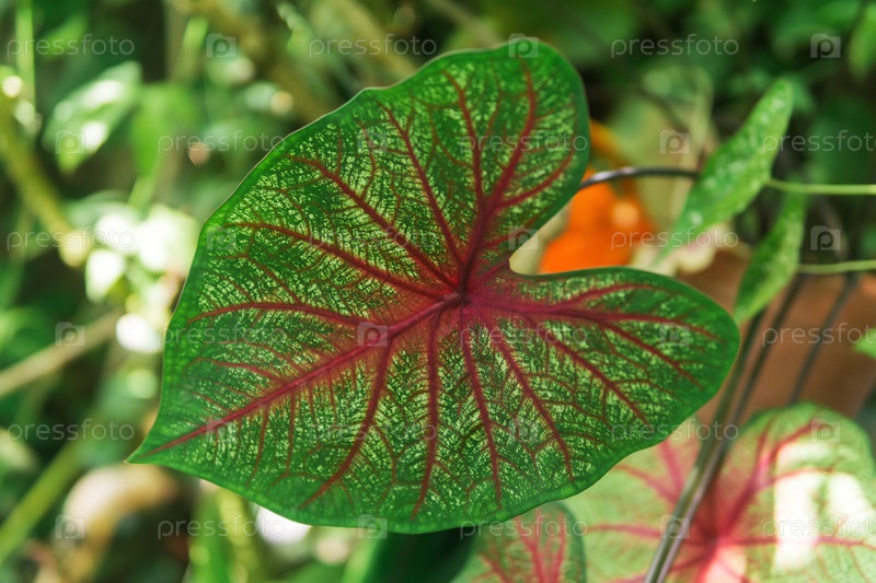 Красивый цветной лист растения каладиума крупным планом