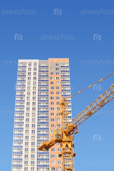 Кабина башенного крана и новый жилой дом на фоне голубого неба
