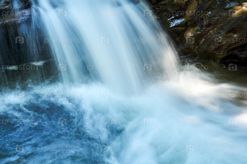 Небольшой водопад в горном ручье между скалами, вода размыта в движении