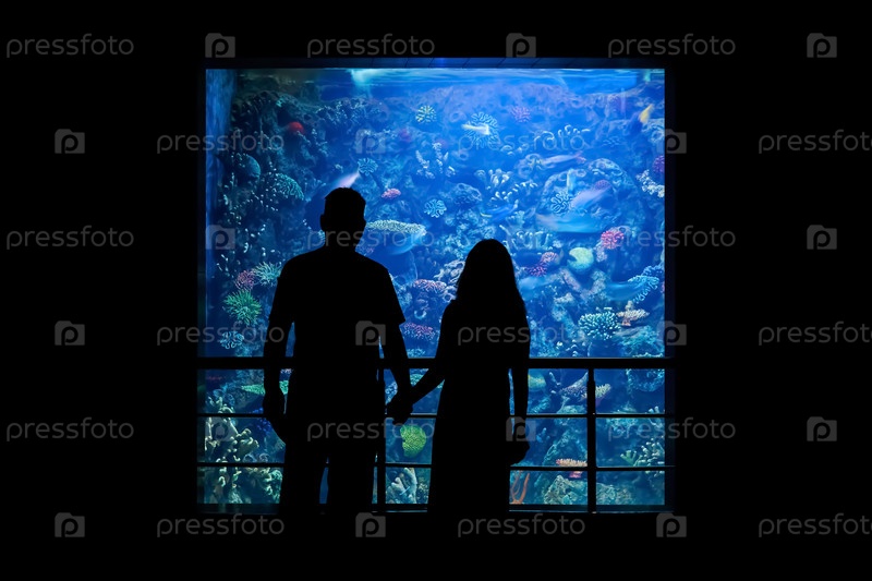 Силуэт пары, смотрящей на подводный мир в большом аквариуме