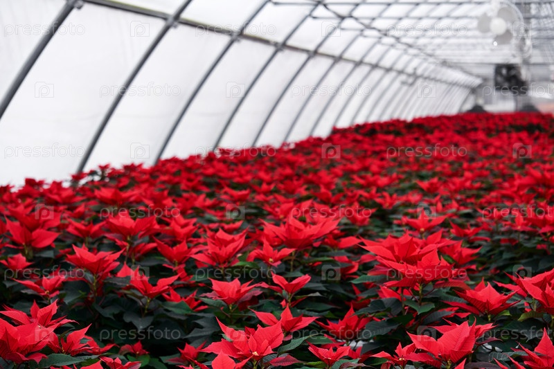 Плантация ярко-красных цветов пуансеттии в теплице в зимний день