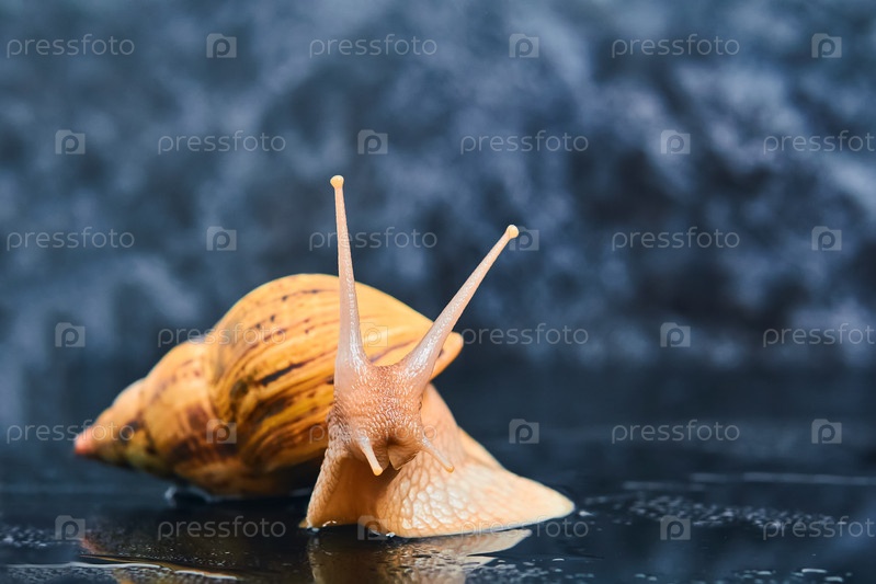 Большая живая улитка на гладкой черной поверхности на темном фоне