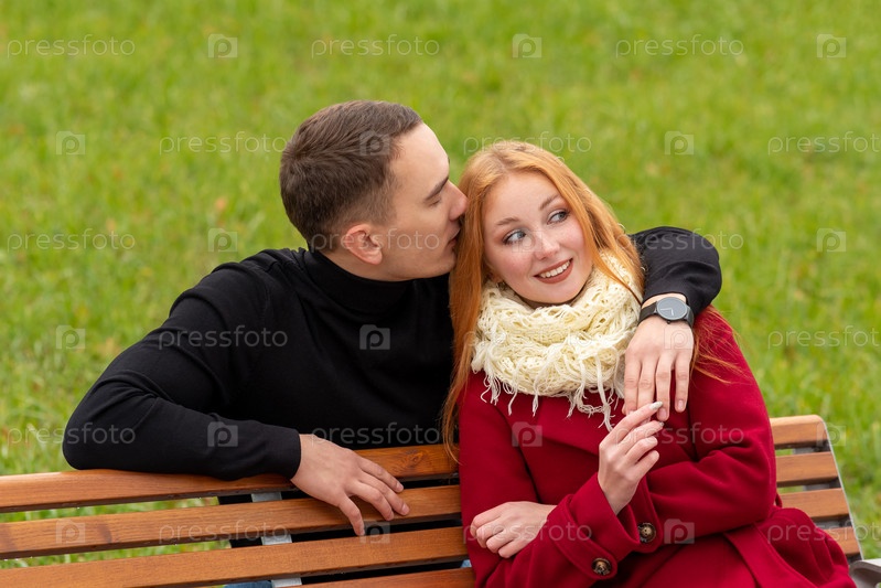 Романтическая молодая пара на скамейке в парке, парень шепчет девушке на ухо