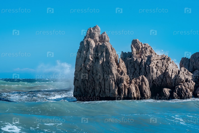 Морские прибрежные скалы среди прибоя в ветреный солнечный день