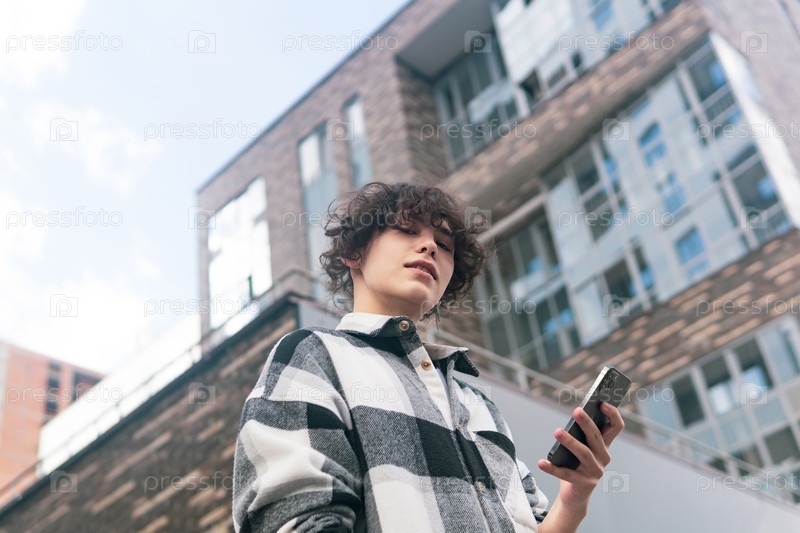 Молодой человек с телефоном на фоне городских зданий