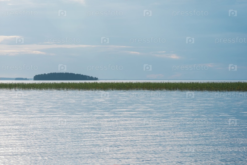 Естественный водный ландшафт, огромное мелкое озеро с тростниковыми берегами в дождливый день