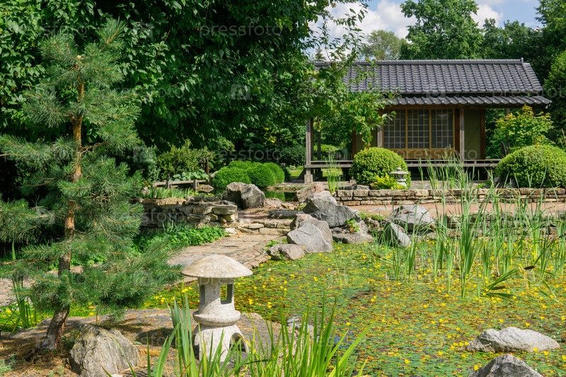 Чайный домик возле пруда в японском саду