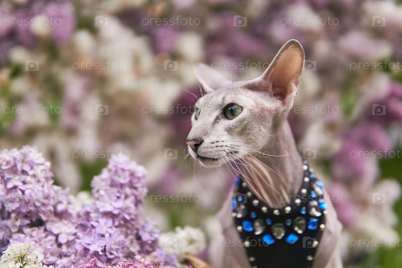 Красивая петерболдская кошка на размытом естественном фоне цветущей сирени