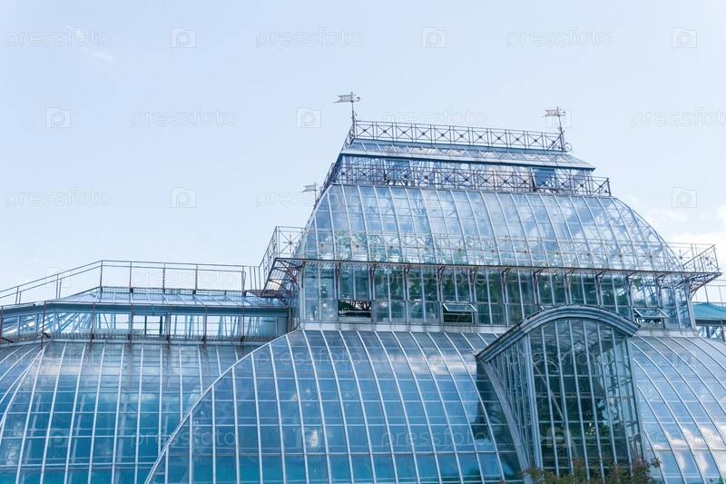 Часть стеклянного купола старинной оранжереи с тропическими цветами