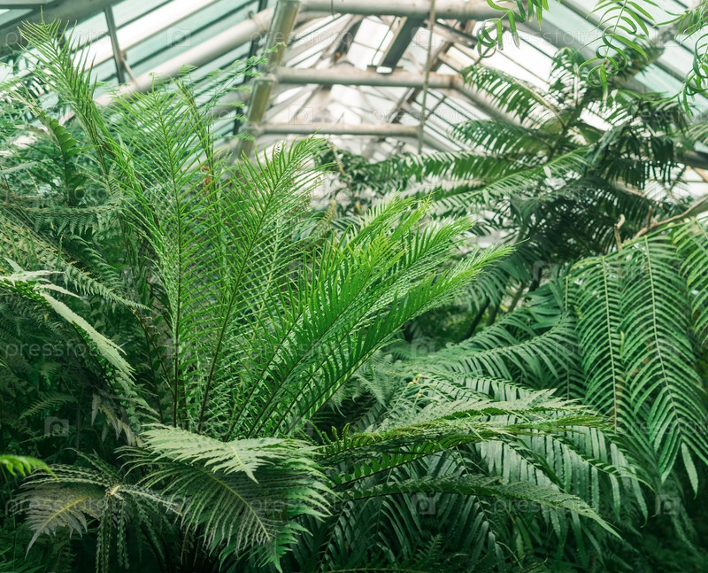 Интерьер большой оранжереи с коллекцией тропических растений