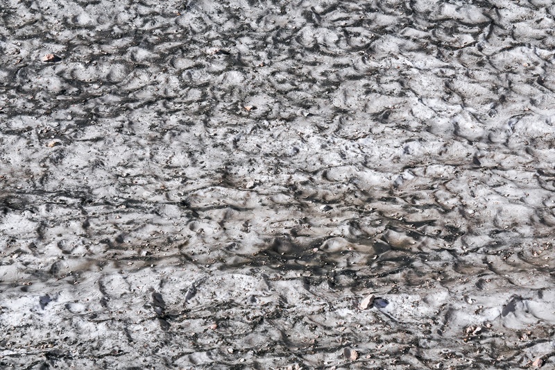 Поверхность тающего горного ледника, покрытая пылью и щебнем