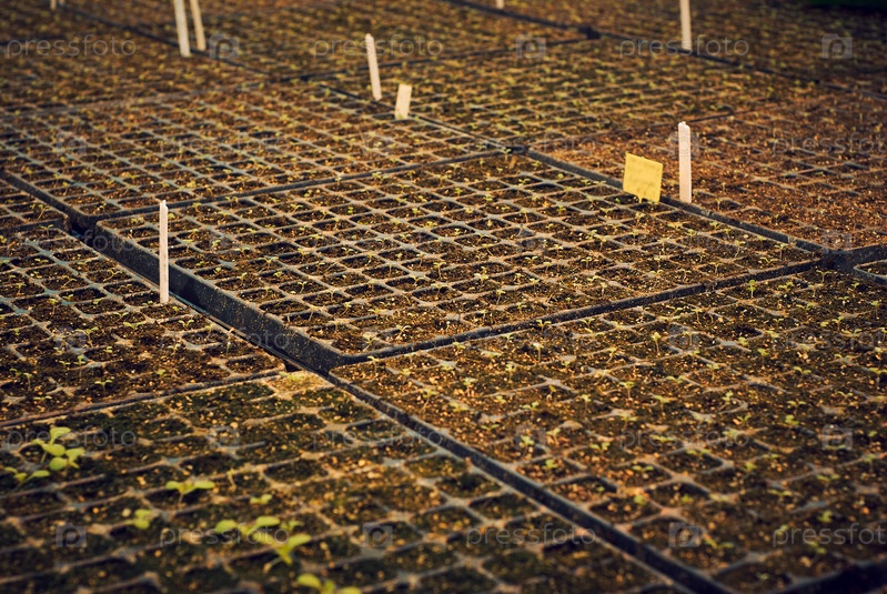 Фон - крошечные ростки растений в лотках для рассады