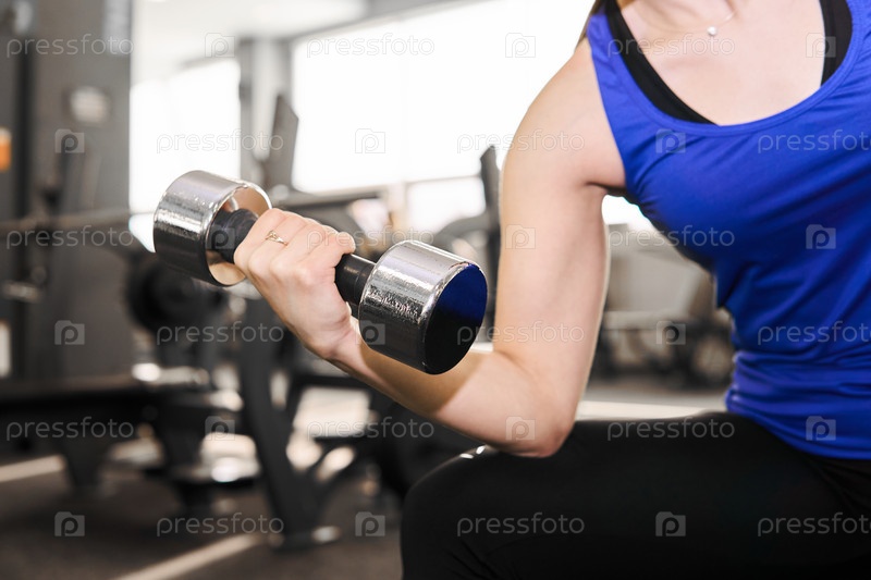 Рука женщины, выполняющей упражнения с гантелями в тренажерном зале