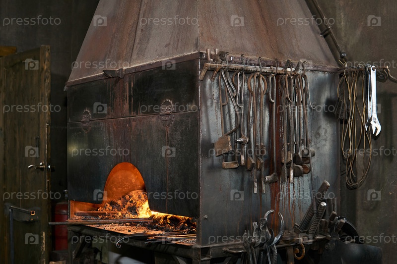 Кузнечная печь с горящим пламенем и кузнечными инструментами