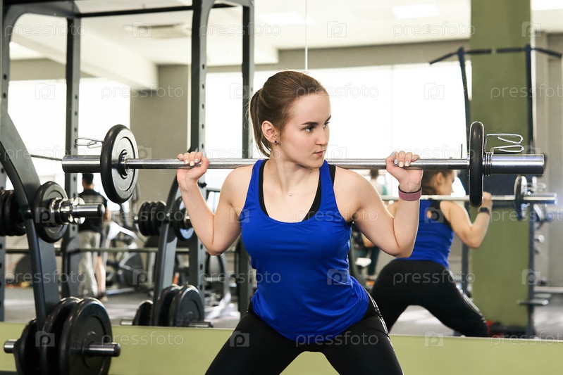 Молодая женщина выполняет приседания со штангой