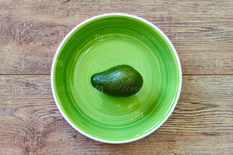 Зеленый авокадо на зеленой тарелке на деревянном столе